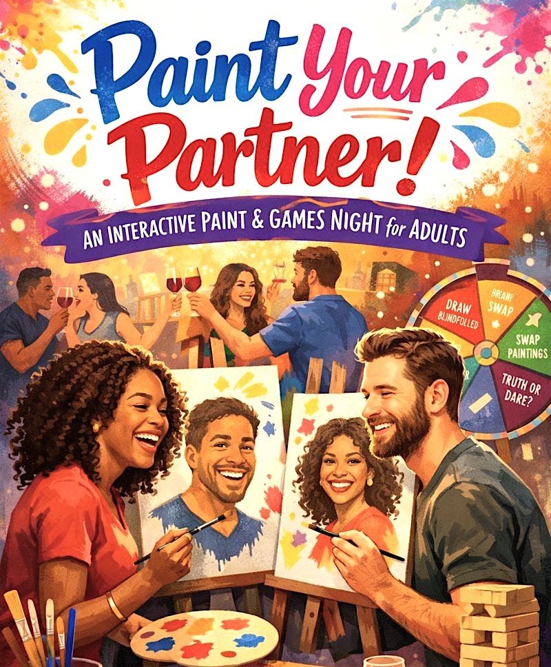 - The first 1.5 hours of the evening, you’ll have the chance to paint each other in a playful, lighthearted way no experience or perfection required! You will be guided with easy instructions, so everyone can relax, explore color and texture, and enjoy the process.