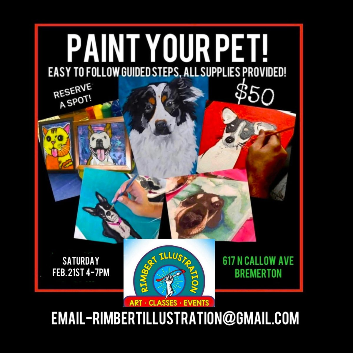 Learn to paint a portrait of your favorite animal friend with step by step guidance at Rimbert Illustration. Learn to paint on Glass or Canvas (your choice) Make your $50 prepaid reservation and Email an adorable Headshot to [email protected] all supplies included and all levels of experience welcome!