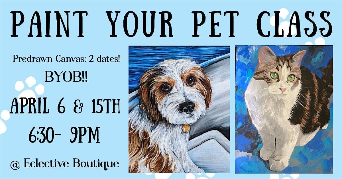 Join us at Eclective Boutique for a fun and relaxed evening where you can paint your pet and unleash your creativity! Mark your calendar for April 6, 2026 at 6:15 PM (Eastern Time). Whether you're a pro or just want to have a great time, this event is perfect for all skill levels. Bring your favorite pet photo and get ready to make some art and memories!
