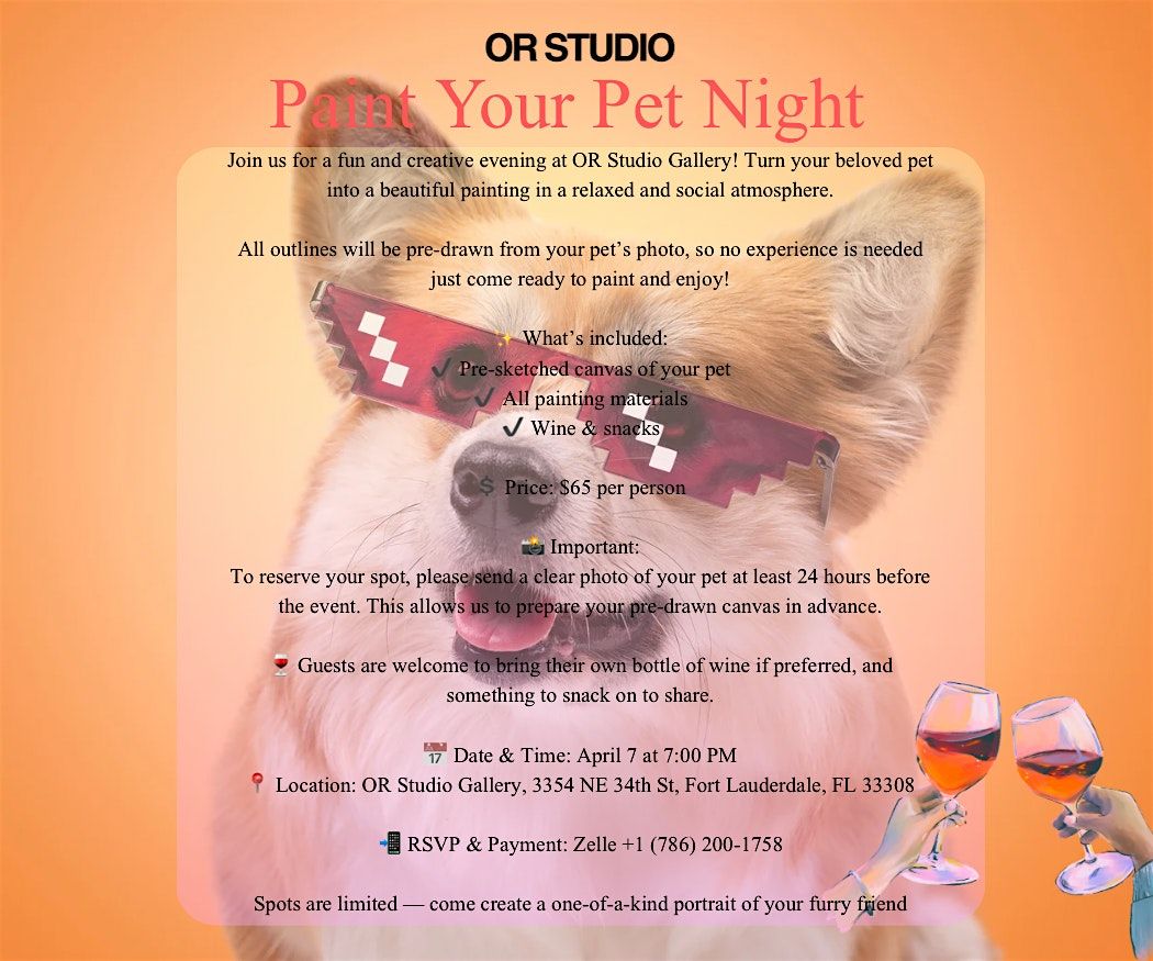 Join us for a fun and creative evening at OR Studio Gallery! Turn your beloved pet into a beautiful painting in a relaxed and social atmosphere.