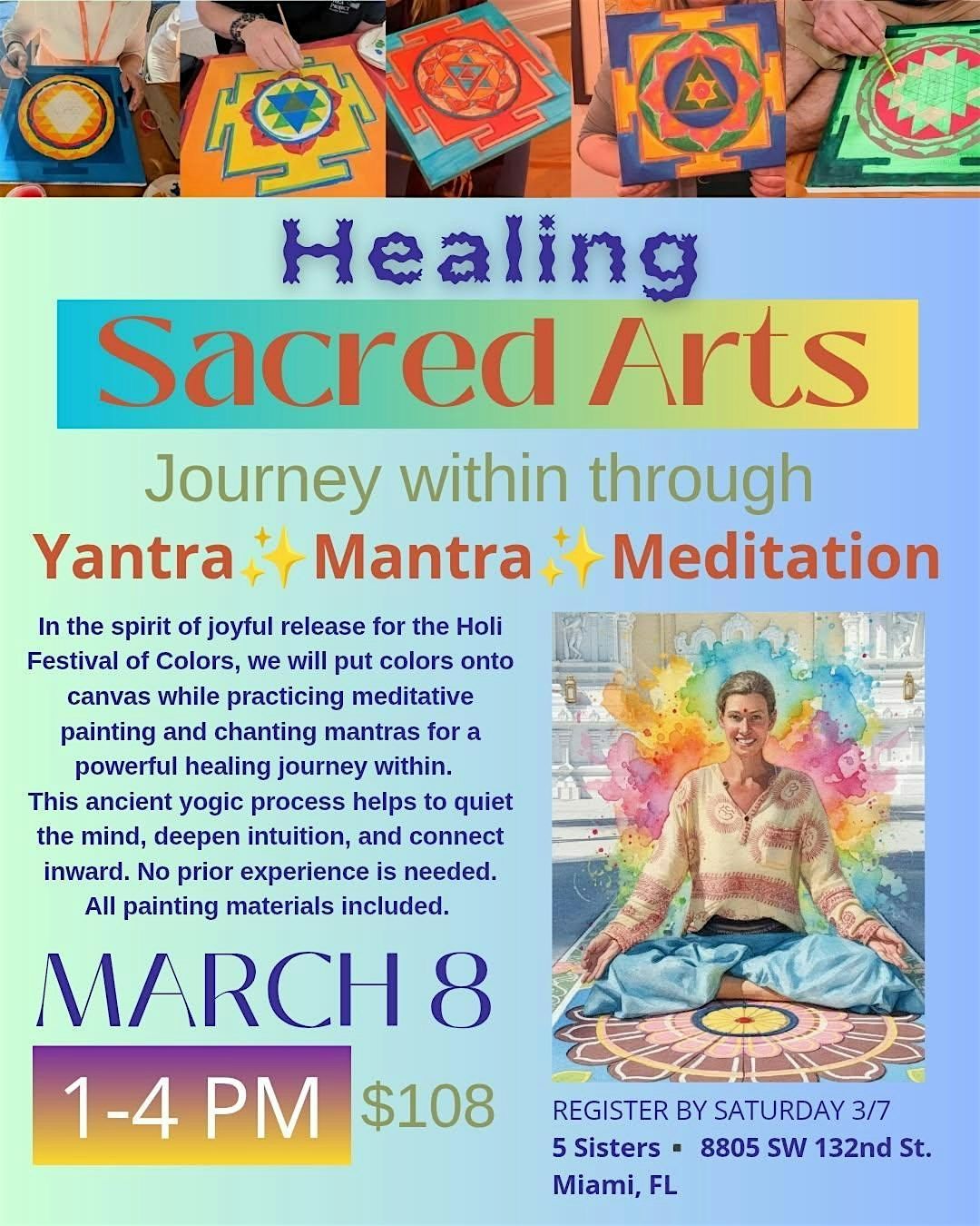 Sunday March 8th 1:00-4:00PM “Paint Your Soul”- A Healing Sacred Arts Workshop & Activation: Grab some loved ones and join us for a Sacred Arts Journey within through Yantra, Mantra & Meditation. Lets tap in the spirit of joyful release for the upcoming Festival of Colors (Holi) We will put colors onto canvas while practicing meditative painting and chanting mantras for a powerful healing journey within. This ancient yogic process helps to quiet the mind, deepen intuition, and connect inward. No prior experience is needed. All painting materials included. $108 Register by March 7th (We highly recommend paying cash on the day of event to avoid the extra fees)