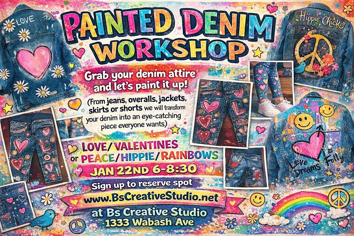 PREWASH your denim piece that you will bring in to paint. Once you register please text me so we can discuss what theme you want to paint (vday, peace, etc) 217-726-6523