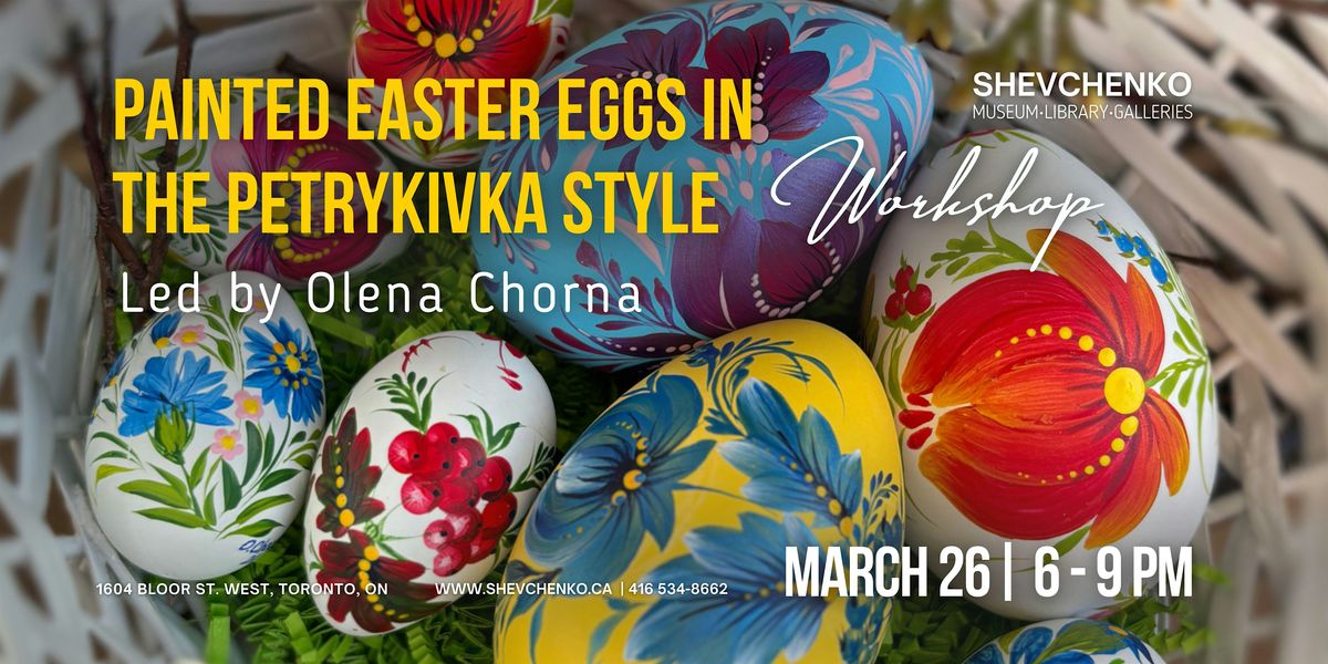 The Shevchenko Museum invites you to a Painted Easter Eggs in the Petrykivka Style Workshop conducted by professional artist, Olena Chorna. In the guided, 2-hour session, you will learn the traditional Ukrainian folk art of Petrykivka painting, first by practising the special delicate brushstrokes on paper and then applying them to an egg form. The finished product will be a lovely, colourful decoration which you can give as a gift or enjoy for yourself, for years to come.