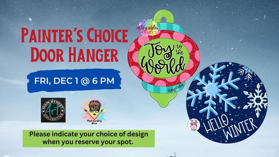 That Crafty Diva, Kate Wells is holding a painters choice class with two fun designs to choose from: a whimsical ornament or snow theme. These wooden door hangers are great for home or office as wall or door decor. Guests may choose other colors if desired. $40 registration fee includes all supplies. Please indicate design choice when you reserve your spot.*Kate will have small bow accents available for purchase for $3 payable directly to her.