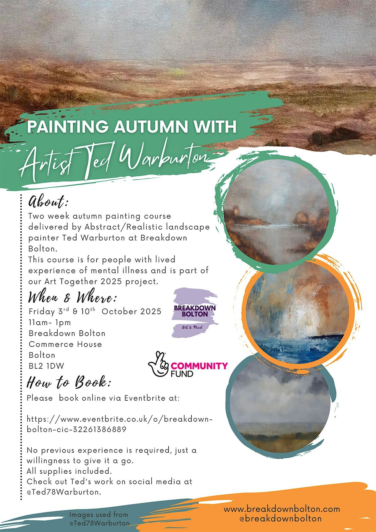 Two autumn painting workshops run by with landscape painter Ted Warburton for people with lived experience of mental health issues which will consist of a live demonstration and then a chance for you to give it ago. This is part of our Art Together 2025 project.