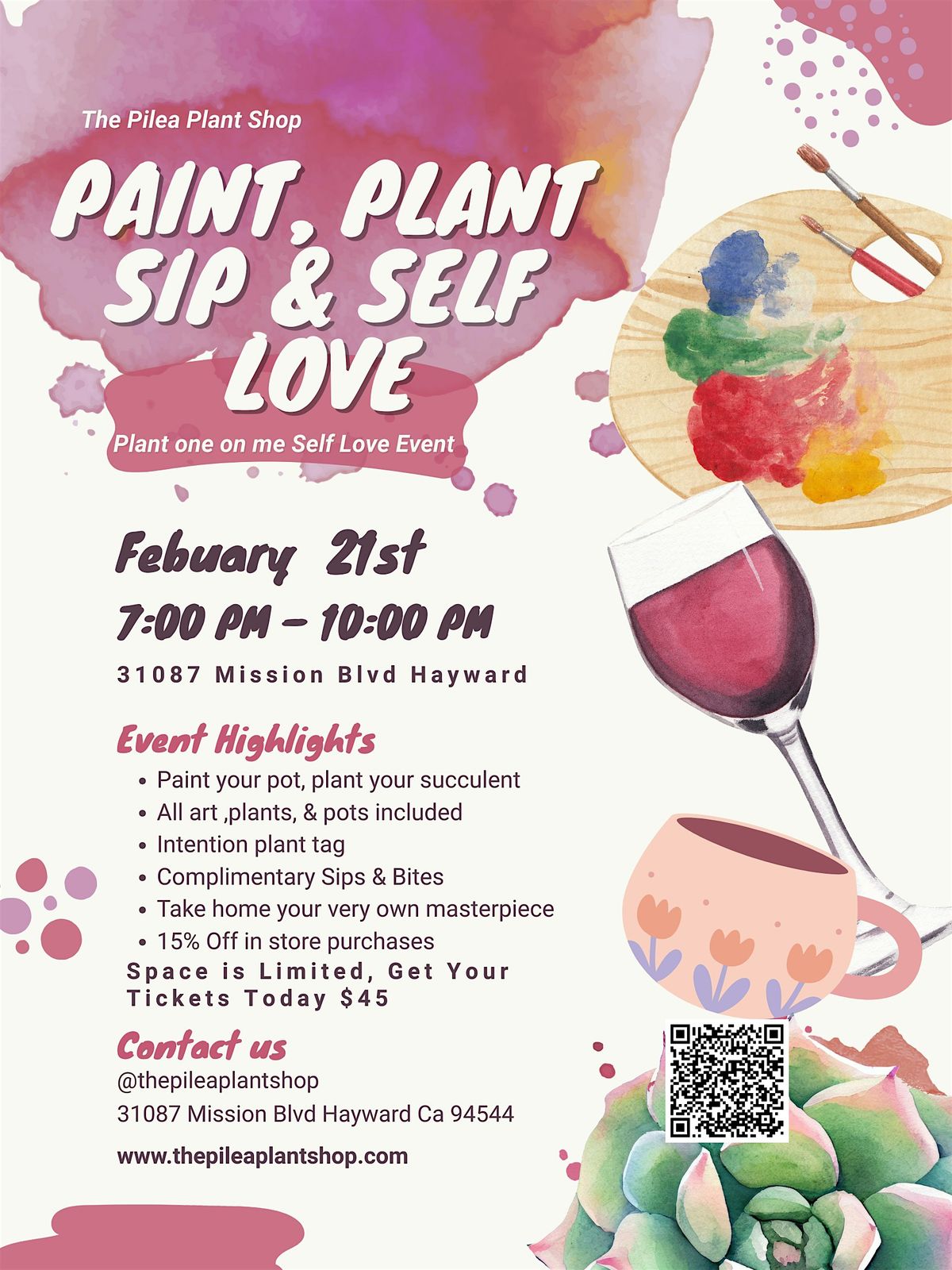 Paint, plant, sip & reset. Self-love night with pot painting, succulent planting, cozy sips & intention setting. Feb 21, 7–10PM. $45.