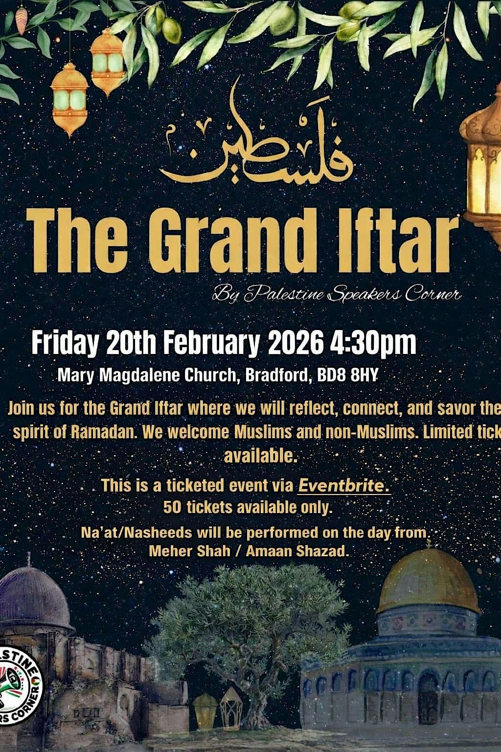 Join us for a Grand Iftar at Palestine Speakers Corner on Friday 20th February , bringing together people from all backgrounds in a spirit of faith, unity, and solidarity with Palestine.