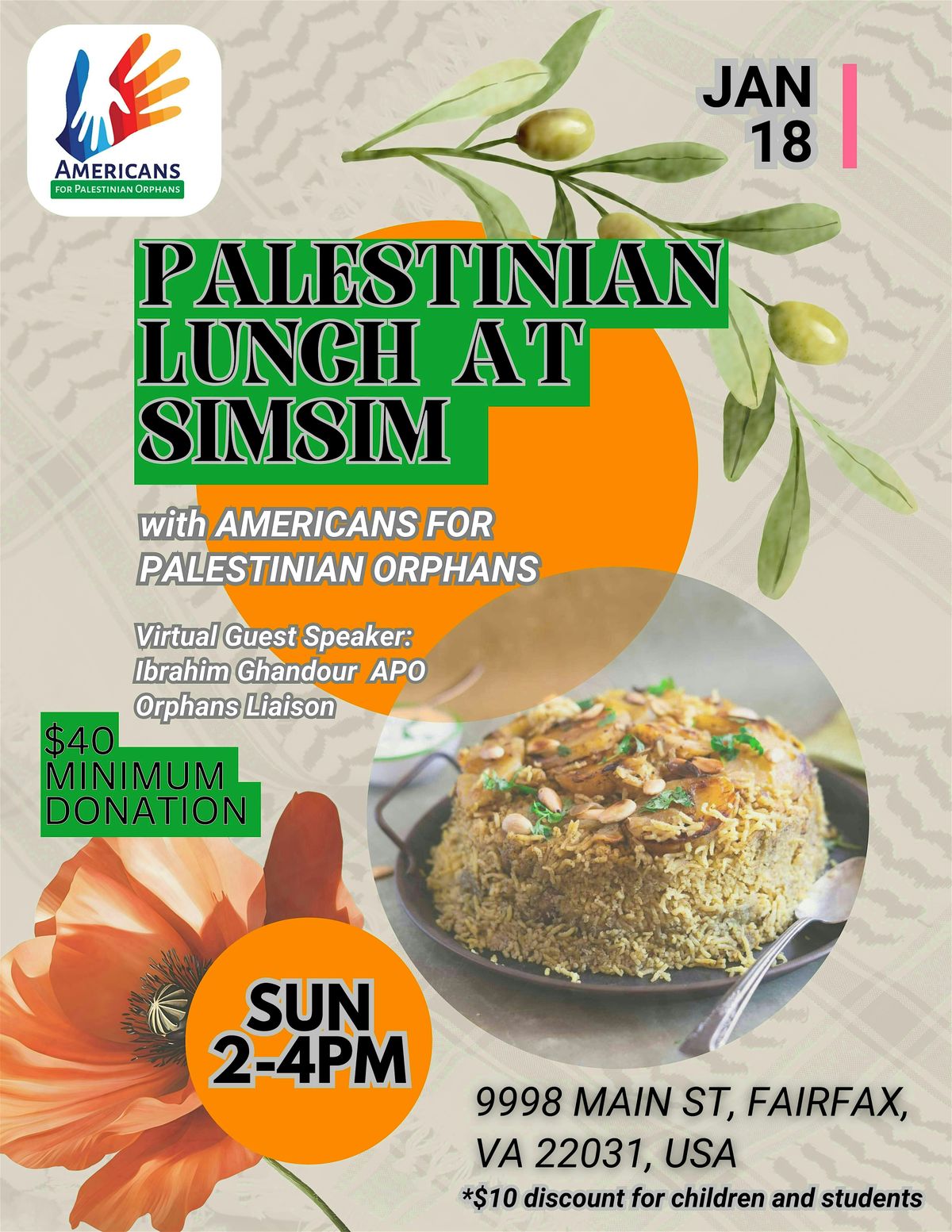 Join us at Simsim for a special Palestinian Lunch Fundraiser benefiting Americans for Palestinian Orphans (APO)—featuring a full Maqloubeh Lunch (the beloved “upside-down” Palestinian dish).