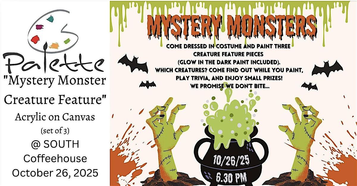 Come join us at South Restaurant + Coffeehouse for a spooktacular painting event! We will be painting three canvases, each featuring a design representing a different classic Halloween creature. It's a spooky surprise, but there will be glow in the dark paint included guaranteed! No experience needed - just bring your imagination and we'll supply the rest. Let your inner artist roam free in a fun and relaxed atmosphere. Grab your friends and make it a monster mash of a good time! What makes this paint experiences unique? You'll be doomed to have a good time as we play classic monster trivia, win small prizes, and paint really fun unique pieces designed just for this class. Costumes are strongly encouraged and SOUTH will be open for you to purchase any food or drink you would like to enjoy along the way. Don't miss out on this unique painting experience!