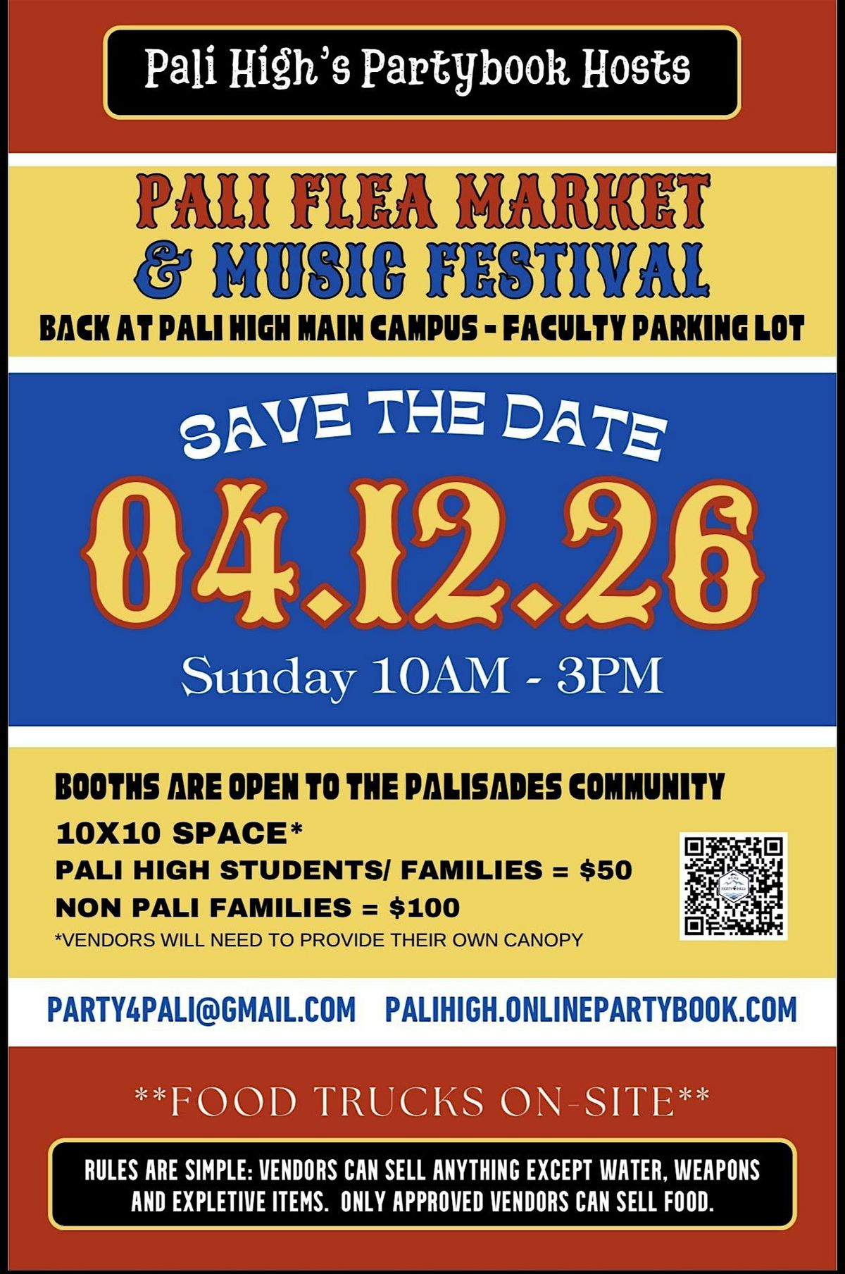Get ready for an epic day of fun, food, and fantastic finds! Dive into a vibrant flea market packed with unique treasures and cool crafts. Then, groove to awesome live tunes at our music festival. It’s the perfect chance to hang out with friends and soak up good vibes in person. Don’t miss out on this awesome combo of shopping and music at Pali High!