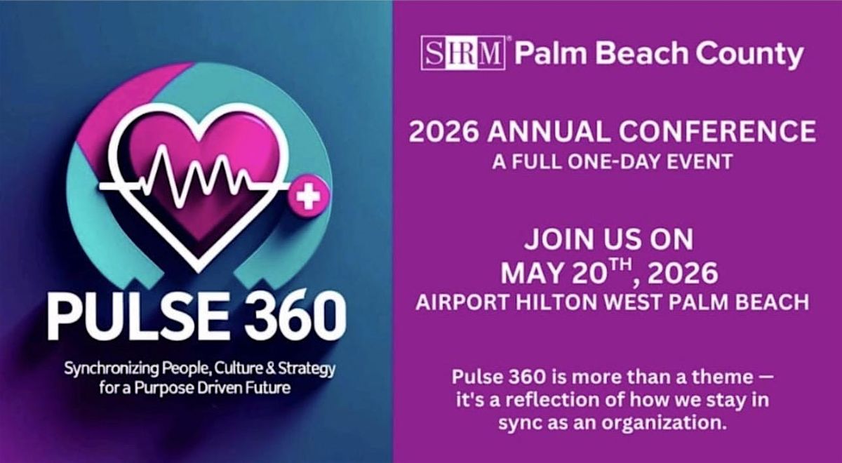 We are thrilled to announce the upcoming 2026 PBC SHRM Annual ONE-DAY Conference, themed "Pulse 360!", Synchronizing People, Culture & Strategy for a Purpose Driven Future! Pulse 360 is more than a theme - it's a reflection of how we stay in sync as an organization. The logo, featuring a heart, and heart rhythm, symbolizes the pulse of our people.