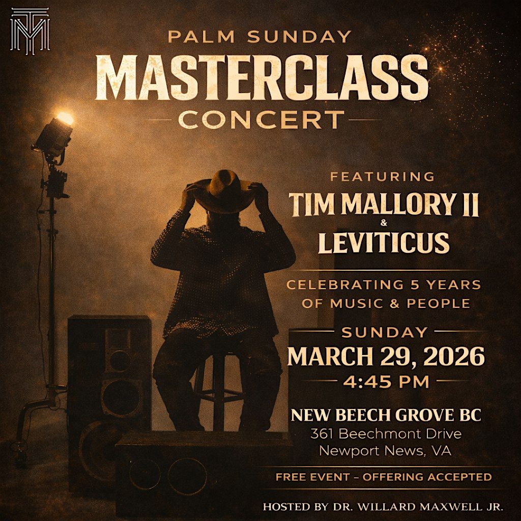 Get ready to experience Palm Sunday: A Masterclass Concert featuring the incredible talents of Tim Mallory II & Leviticus. It's going down on March 29, 2026 at 4:45 PM.