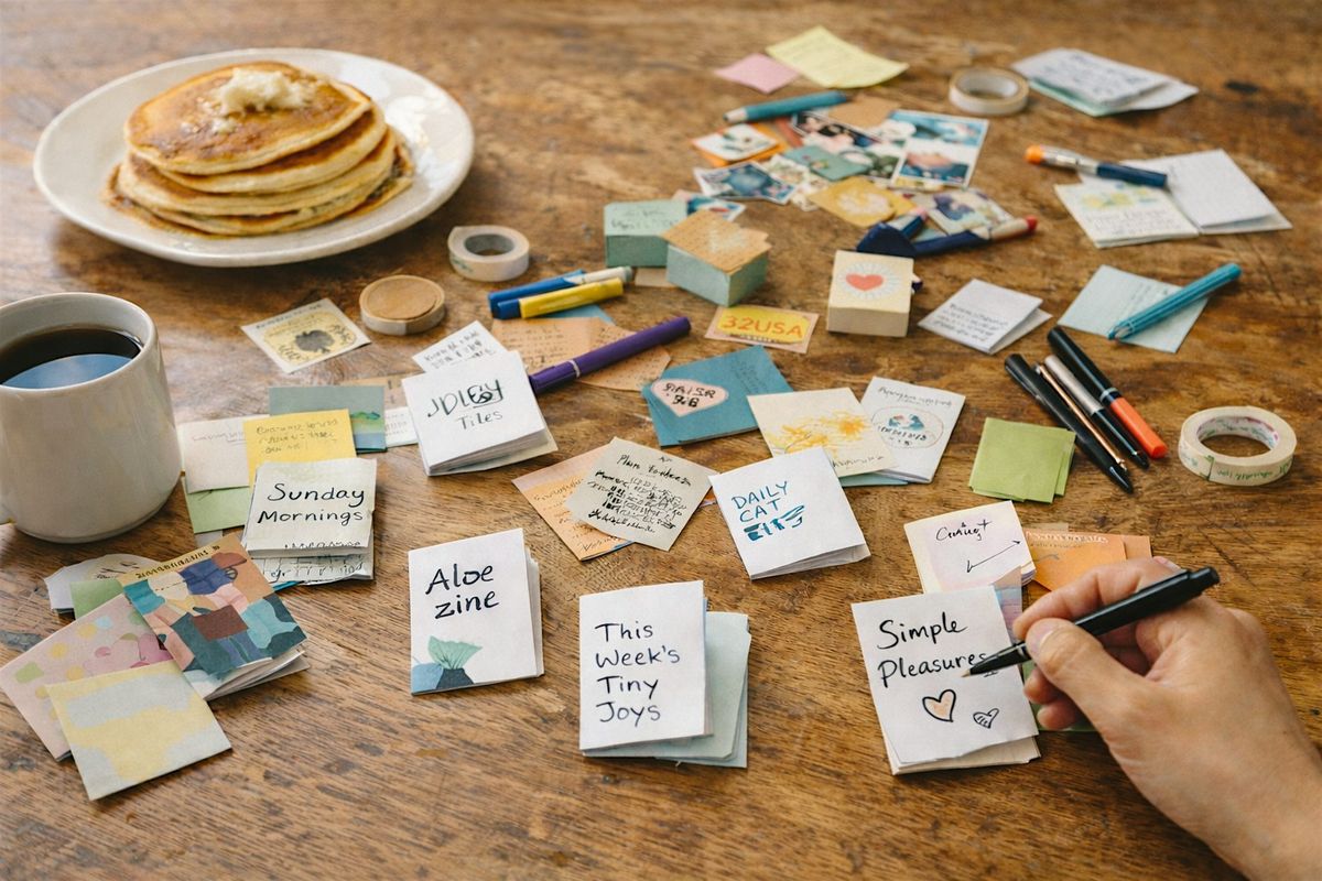 You can make something meaningful, silly, abstract, reflective, or wildly mundane. You might keep your zine, gift it, trade it, or simply enjoy the process and move on with your day feeling a little lighter.