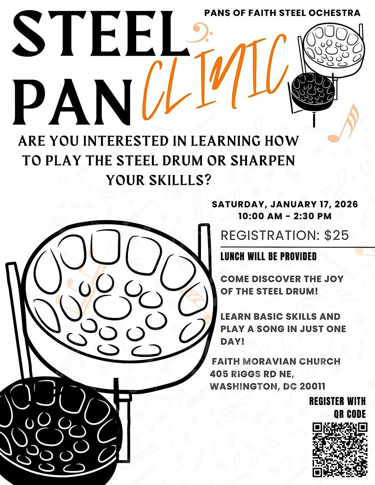 - A friendly, welcoming clinic led by experienced members of Pans of Faith Steel Orchestra — no prior musical background needed.