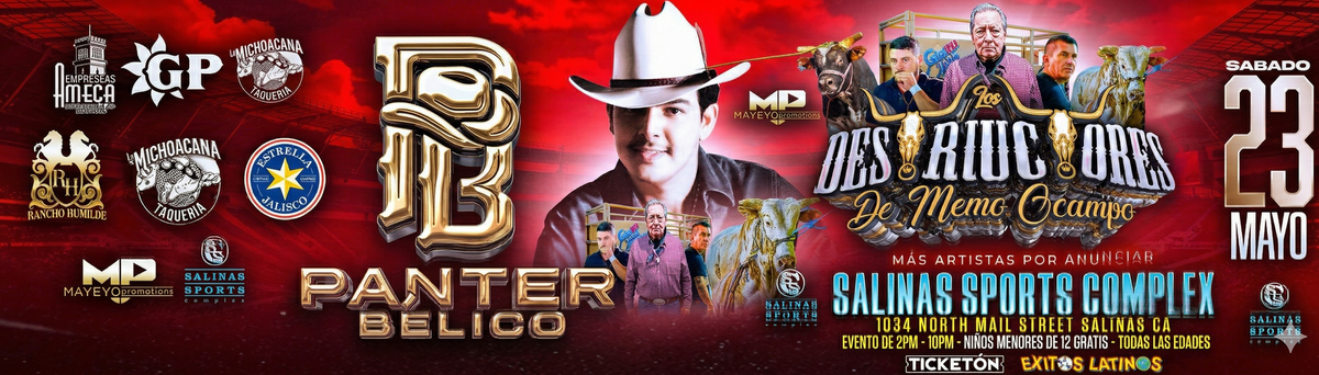 Don't miss PANTER BELICO & DESTRUCTORES DE MEMO OCAPO happening at Salinas Sports Complex, Salinas, CA, United States on 2026-05-23T14:00:00-08:00. A great evening with good music and a laid-back atmosphere awaits you. Invite your friends for a night out! **Event Details:** * **Location:** Salinas Sports Complex, Salinas, CA, United States Claim your ticket to be at the forefront of exciting innovation. #PANTERBELICO&DESTRUCTORESDEMEMOOCAPO #event #exciting #SalinasEvents #CAEvents