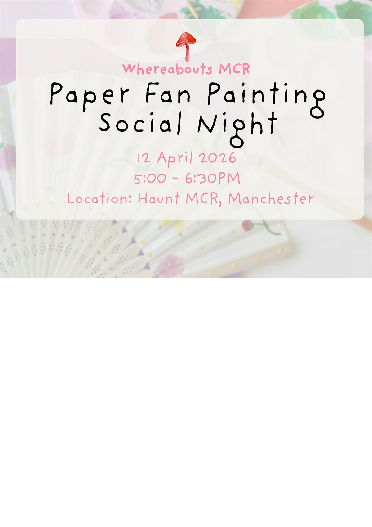 Join us at Haunt MCR on April 12, 2026 at 5:00 PM (BST) for a chill evening of creativity and fun! Bring your friends or come solo to paint your own paper fan, meet new people, and enjoy a relaxed vibe. No experience needed—just bring your good energy and get ready to make something cool. Can't wait to see you there!