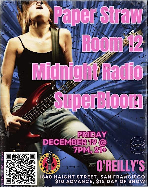Get ready for an epic night with PAPER STRAW, ROOM 12, MIDNIGHT RADIO, and SUPERBLOOM all in one place! This is an in-person event packed with great vibes, awesome tunes, and nonstop energy. Don’t miss out on the chance to catch these acts live and soak up the atmosphere. Grab your crew and join the fun—it’s gonna be a night to remember!