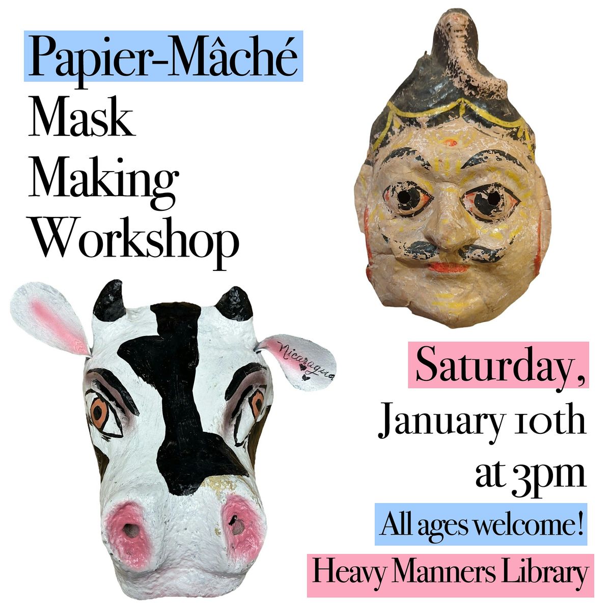 Join us for a papier-mâché mask making workshop, an activity fun for all ages! Learn history about masks making and papier-mâché, then make your own! This workshop will primarily focus on constructiong techniques for the mask, but the masks can be painted at home once dried.