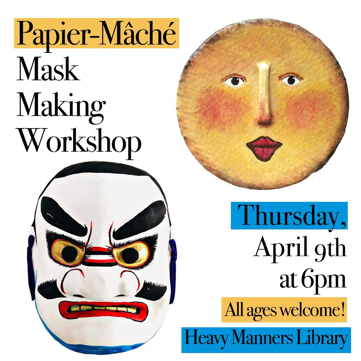 Join us for a papier-mâché mask making workshop, an activity fun for all ages! Learn history about masks making and papier-mâché, then make your own! This workshop will primarily focus on constructiong techniques for the mask, but the masks can be painted at home once dried.
