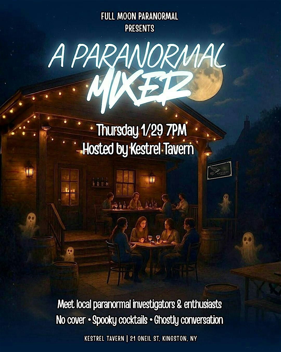 Join Full Moon Paranormal for a relaxed Paranormal Mixer at Kestrel Tavern - a casual, spooky-themed social night for local paranormal investigators, enthusiasts, and the curious.