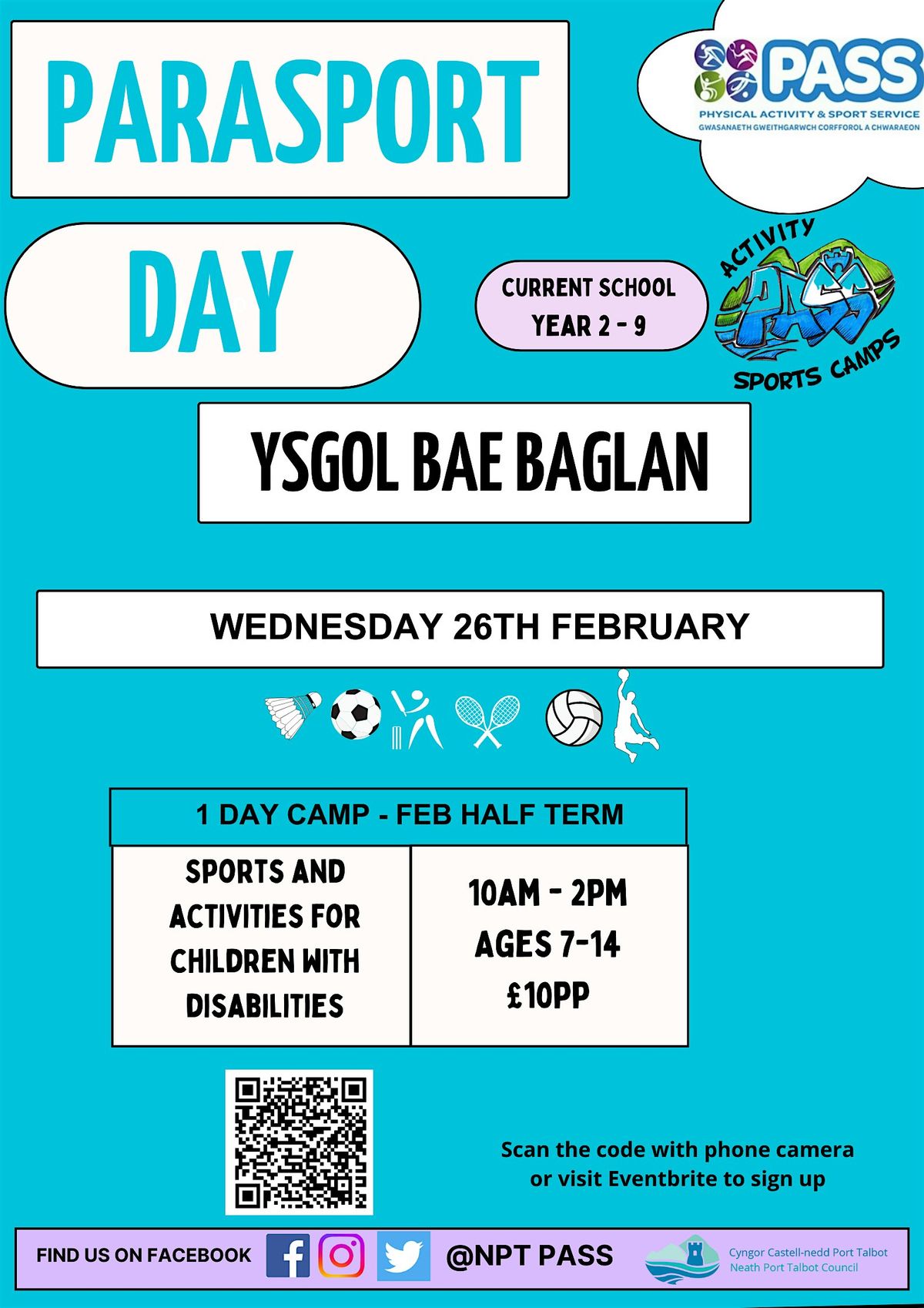 A ParaSports day based at Ysgol Bae Baglan delivering sports and activities for children with disabilities, aged 7-14. The day will take place on Monday 30th March, 10.00 -14.00, cost £10.