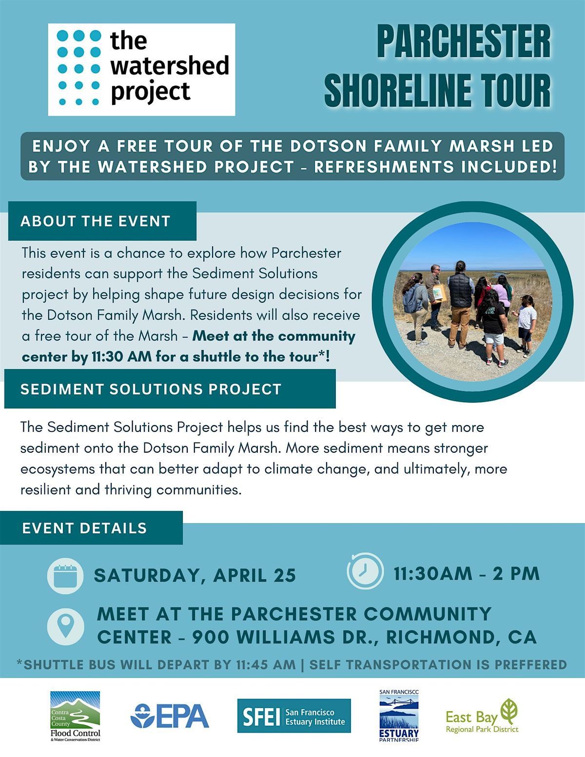 Join the Watershed Project for a free tour of the Dotson Family Marsh behind the Parchester Village neighborhood! We will meet at the Parchester Community Center by 11:30 am and then caravan to the Dotson Family Marsh together. There will be a shuttle for individuals who are unable to drive themselves to the Marsh for the tour. During this tour we will learn about the marsh and how it helps protect the Parchester community and help shape its future, with the support of the San Francisco Estuary Institute (SFEI). This tour will include a light lunch, short walk along the marsh, and information on the plants, animals, and people who call it home.