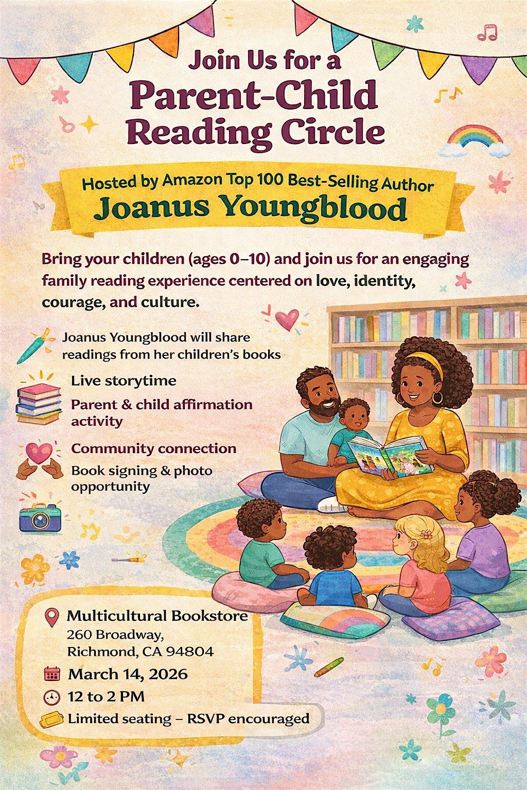 Join us for a heartwarming and engaging Parent–Child Reading Circle featuring Amazon Top Best-Selling Author Joanus Youngblood. This special in-person event is designed to bring families together through the power of storytelling.