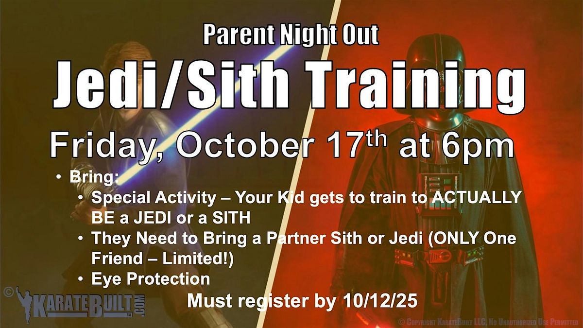 KarateBuilt Martial Arts is hosting a FREE Parent Night Out on October 17th! The theme is Jedi/Sith Training so while you parents are on date night, we'll teach your kids how to use the force, battle with lightsabers and have them navigate through the galaxies most dangerous obstacle course! Space is limited so call us today at 480-575-8171 to reserve your spot!