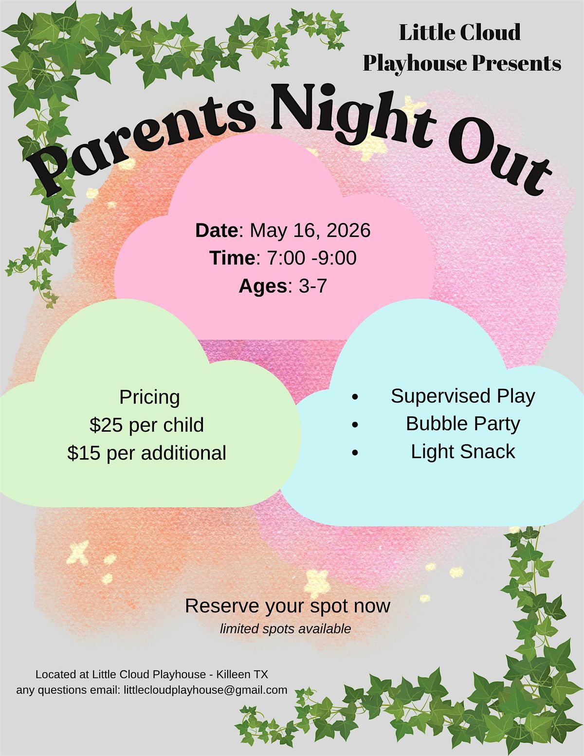 Join us for Parents Night Out at Little Cloud Playhouse! An evening of supervised play, activities, and light snacks.
