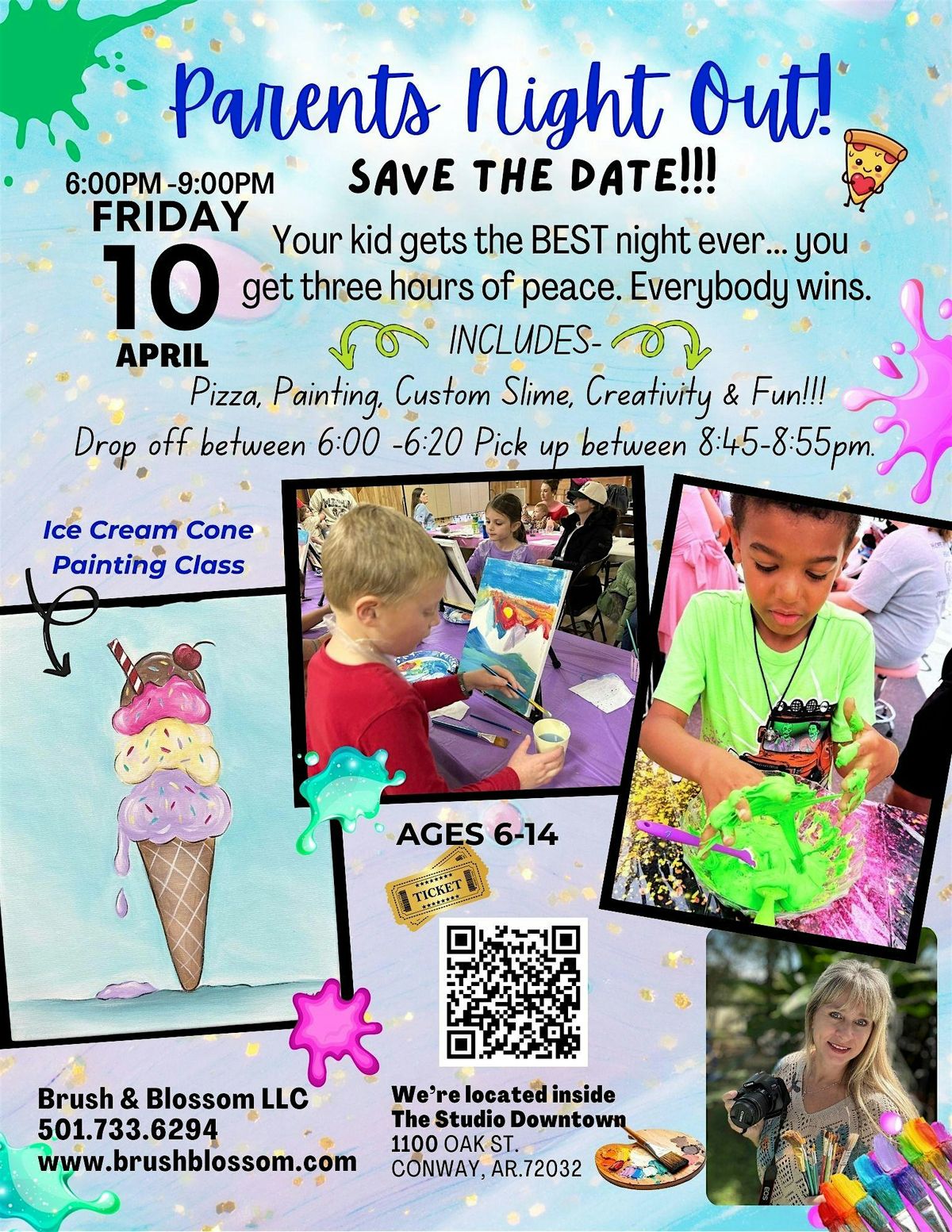 Looking for a fun evening off? Drop the kids off at our Kids Art Camp and enjoy some Parents Night Out time! Your little artists will dive into creative projects, we're painting an Ice Cream Cone, eating pizza & making custom SLIME, make new friends, and have a blast—all in person. All the supplies are included! It’s the perfect chance for parents to relax while the kids get inspired. Don’t miss out on this awesome combo event! This Art Camp is for ages 6-14 years.