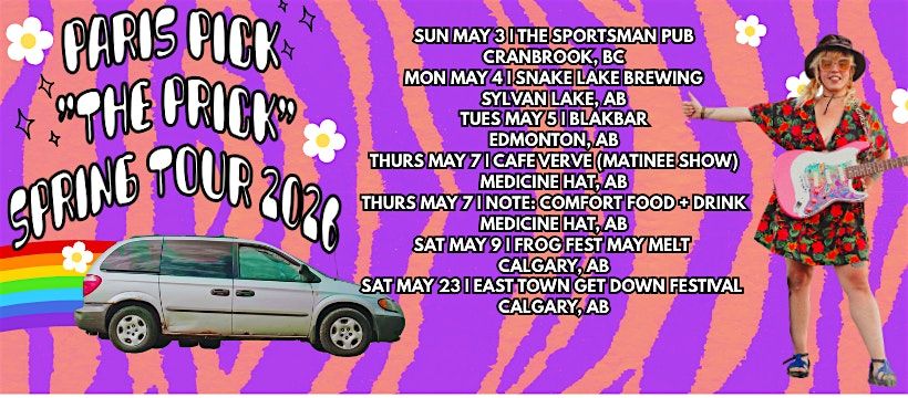 Since 2013, Paris Pick, the self-proclaimed “Yacht-Pop Princess” and frontwoman of Paris Pick & The Pricks (hence “The Prick”), has been making waves with her signature brand of alt yacht-pop-rock music, showcasing her knack for writing shimmering hooks and breezy mid-’70s-inspired melodies that linger long after the show. From honing her craft in Whitehorse, Yukon for many years, to now being based in BC where Pick was born, Paris has spent the past decade touring extensively and performing at standout festivals both nationally and internationally. Recently named to Exclaim!’s New Faves: Hottest Canadian Artists You Need to Hear Right Now, and previously a CBC Music Toyota Searchlight Top 100 artist, Pick continues to carve out a niche sound and presence within the Canadian indie music scene.