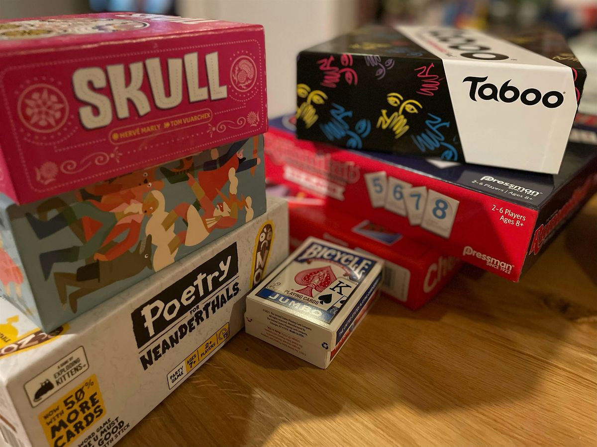 Bananagrams, Boggle, Bucket of Doom, Checkers, Codenames, Connect Four, Jenga, Monikers, Pictionary, Poetry for Neanderthals, Quick Quick Quick, Qwirkle, Rummikub, Saboteur, Skull, Taboo, Taco Cat Goat Cheese Pizza, Uno, Yahtzee