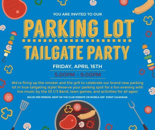 KCCC Members and their guests are invited to celebrate our newly paved parking lot with our very first Parking Lot Tailgate Party! We'll be firing up our new smoker and the grill to celebrate. Reserve your parking spot for a fun evening with love music by the 33 1/2 Band, lawn games, and outdoor activities for all ages!