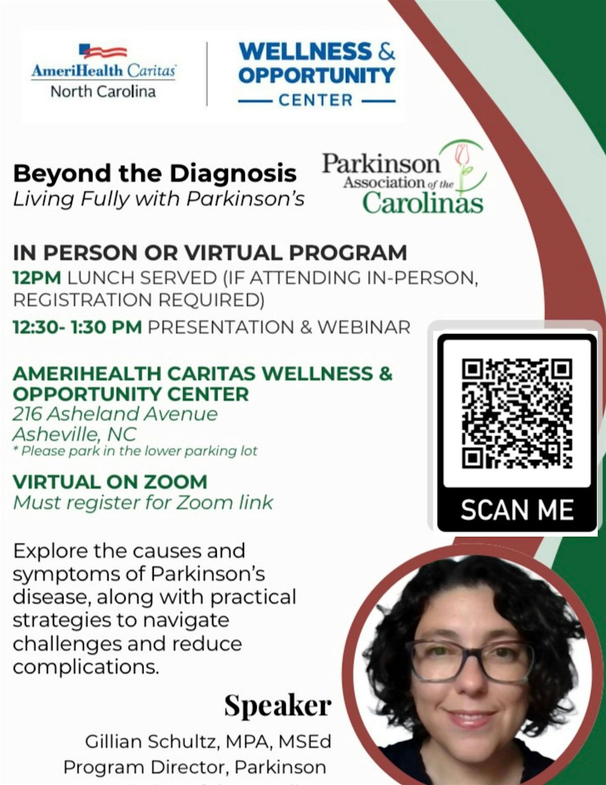 Gillian Shultz with Parkinson Association of the Carolinas joins ACNC's Wellness & Opportunity Center for a LIVE webinar: BEYOND THE DIAGNOSIS - Living Fully with Parkinson's.