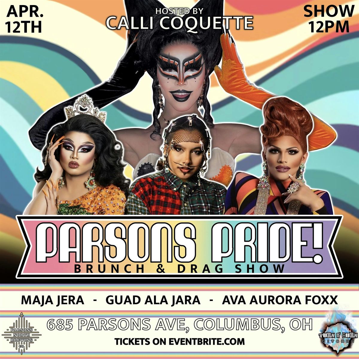 Welcome to PARSONS PRIDE! Brunch and Drag Show at Parsons North Brewing Company! Get ready for a fabulous afternoon of delicious brunch, drinks, and jaw-dropping drag performances! Hosted by Calli Coquette and featuring the best entertainment Columbus has to offer... including Maja Jera, Guad Ala Jara, and Ava Aurora Foxx!