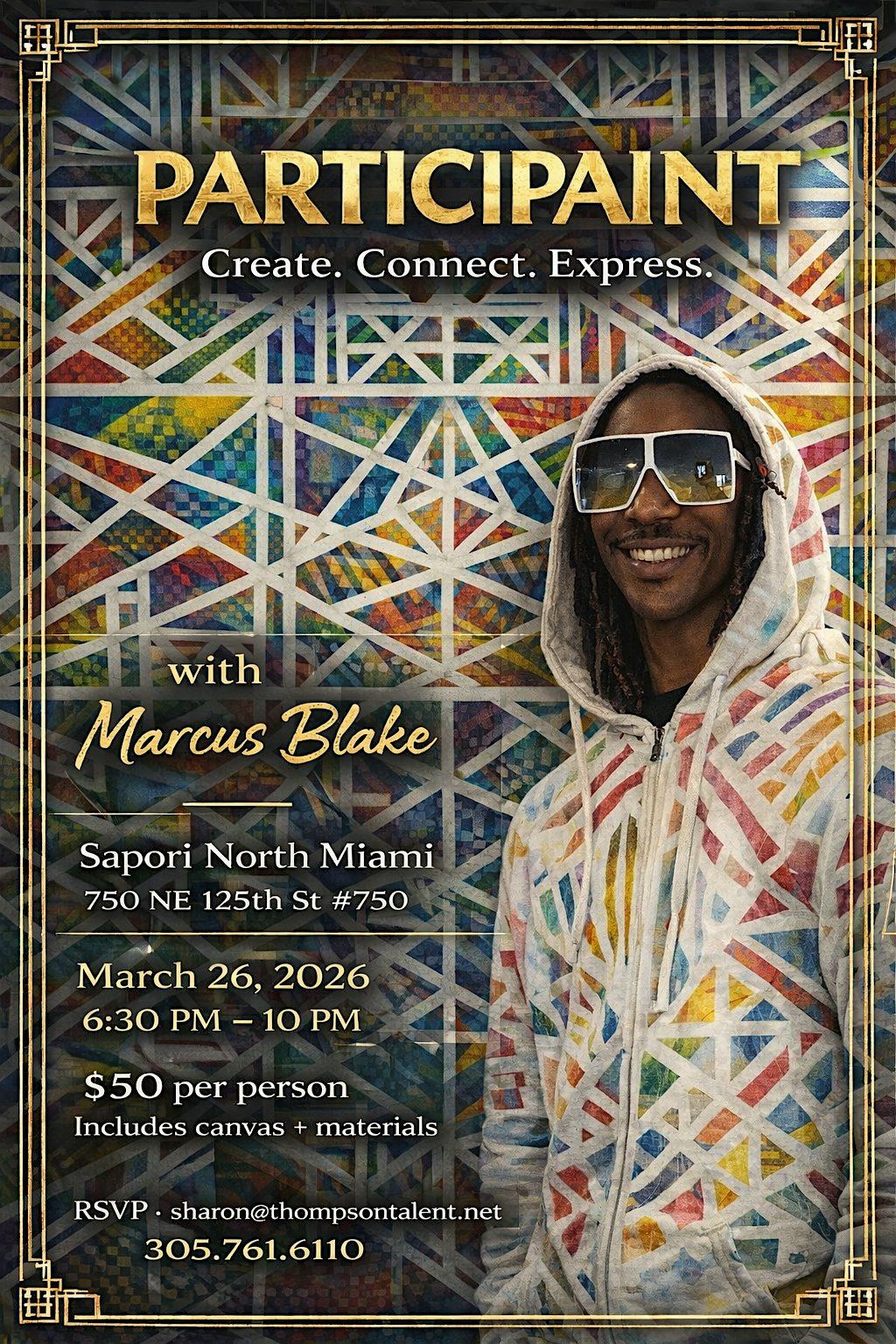 Step into a creative experience with Miami artist Marcus Blake, creator of Tapenology. PARTICIPAINT is an interactive painting session where guests are invited to relax, connect, and express themselves through art.