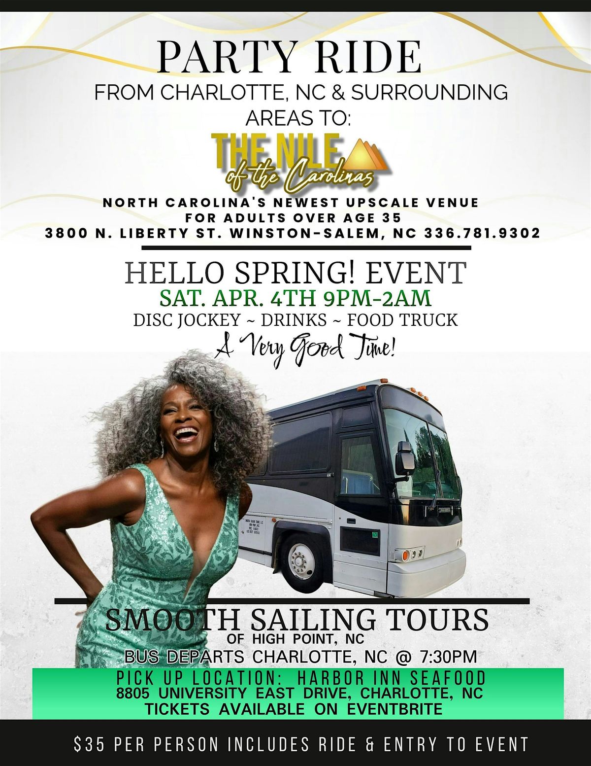 Smooth Sailing Tours of High Point, NC will bus you to The Nile of the Carolinas, the newest party spot for adults 35 and older, and bring you back.
