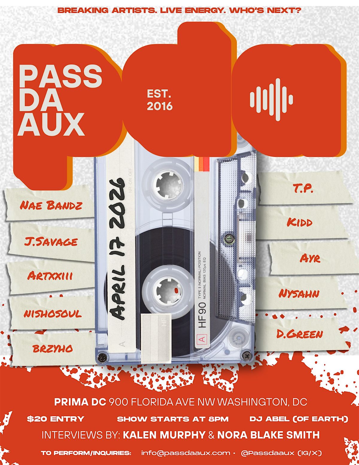 This isn't your average open mic or artist showcase. We are Pass Da AUX, an independent & local music outlet in the Washington, D.C. area highlighting all things D.M.V. Music. Think 106 & Park but on U Street. This is an experience, a live show. Our goal at this time is to lift the scene so we encourage patrons to discover DMV talent! We're back with our show series and have fire lineup for you! Performing Friday April 17, 2026 we have the BEST DMV Rappers only featuring:
