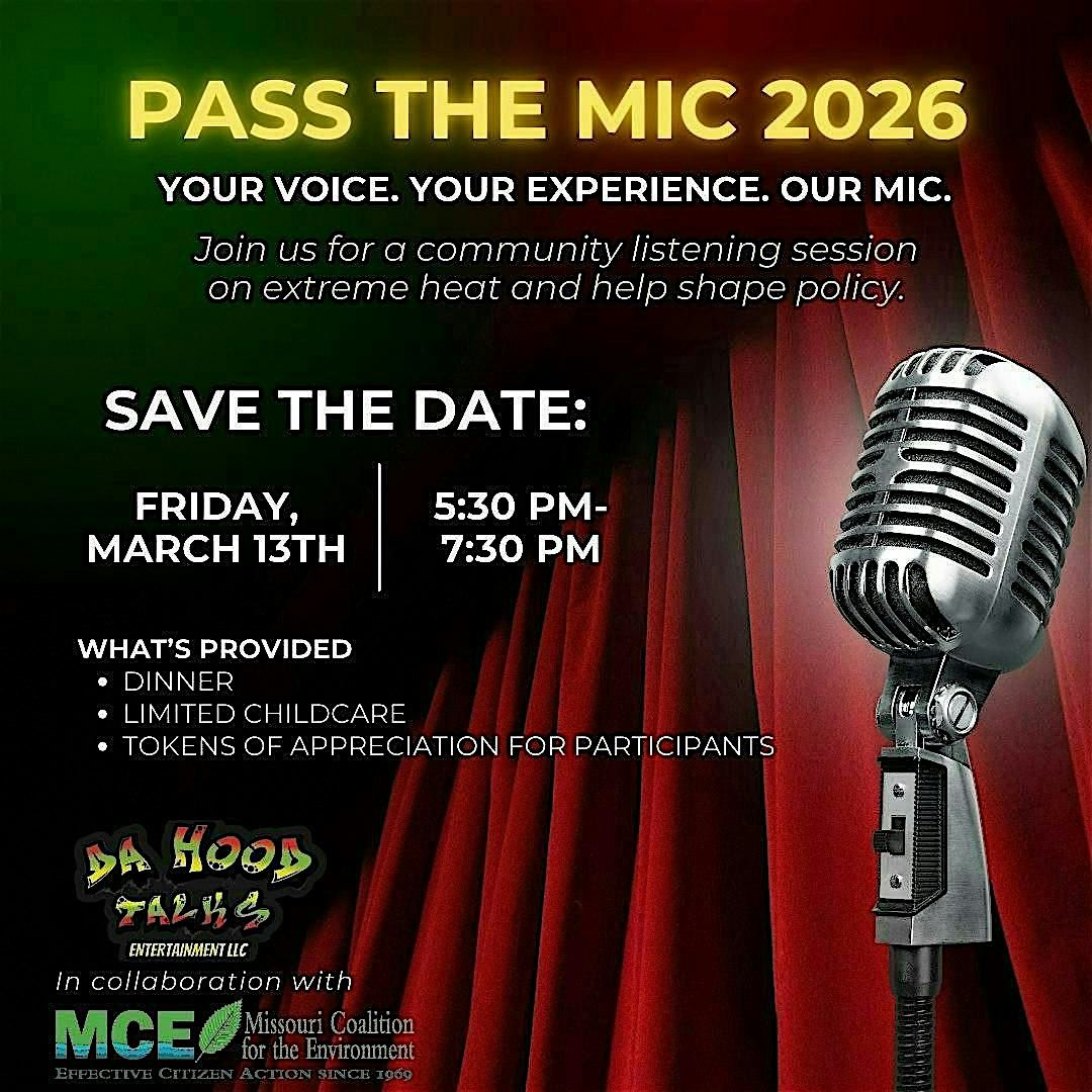 Join us for Pass the Mic, a community listening session hosted by Da Hood Talks Entertainment, designed to center lived experience and elevate local voices around an Extreme Heat policy by Missouri Coalition for the Environment(MCE) that directly impacts our city.