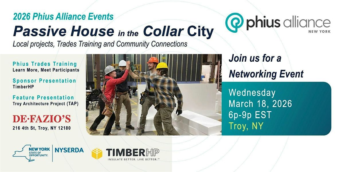 Passive House in the Collar City brings together designers, builders, tradespeople, and building owners to explore high-performance building work happening in Troy and the greater Capital Region. The evening will feature local Passive House projects, insights from PHIUS Trades Training, and time to connect with others advancing better buildings through shared knowledge and collaboration.