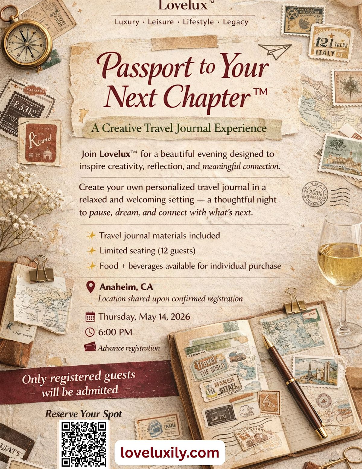 Join Lovelux™ for a beautiful and inspiring evening where you’ll create your own personalized travel journal in a relaxed, welcoming setting.