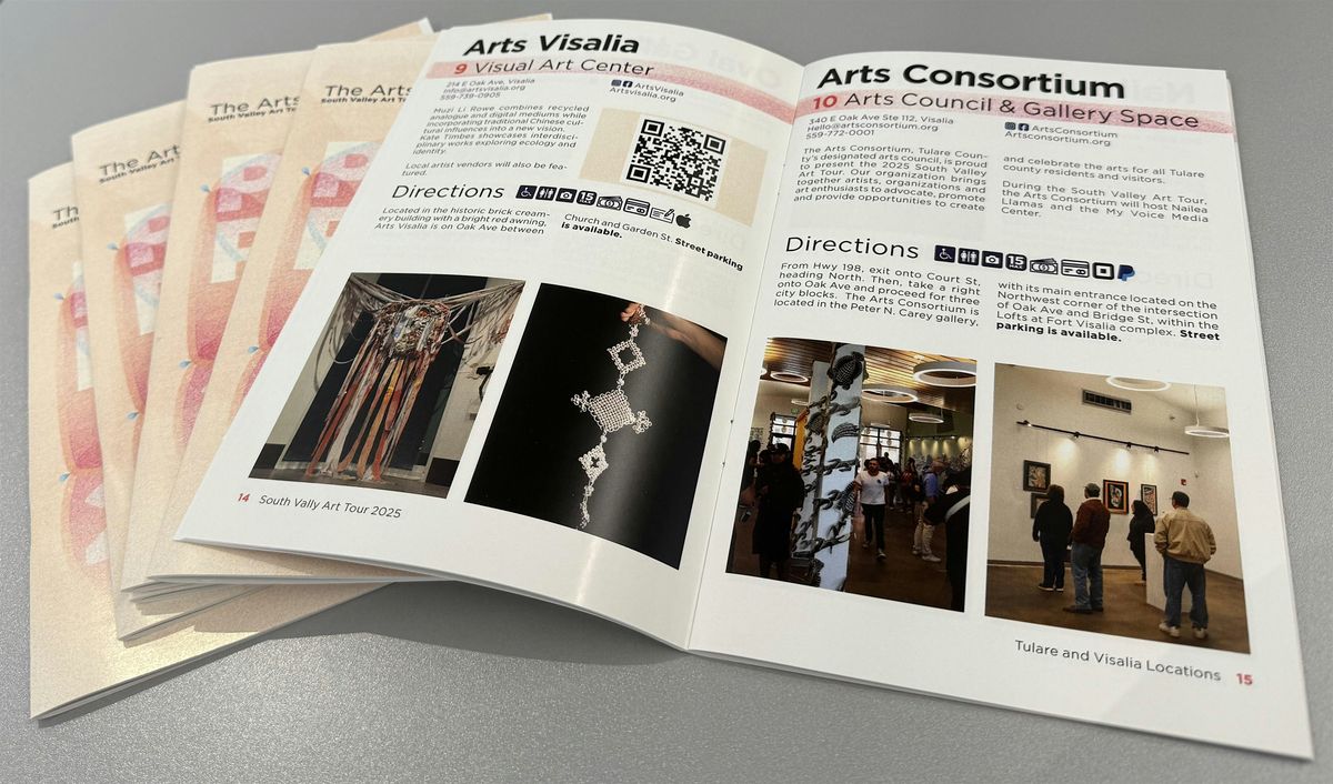 The SVAT Passport is the official travel guide for the South Valley Art Tour event that contains all the information needed for this Tulare County-wide two-day event. Visitors of the art studios and art venues use the SVAT Passport to find addresses, directions, and parking information for each stop among additional information like an artist/venue bio, ameneties available, method of payments accepted, and images that showcase the artist's work.
