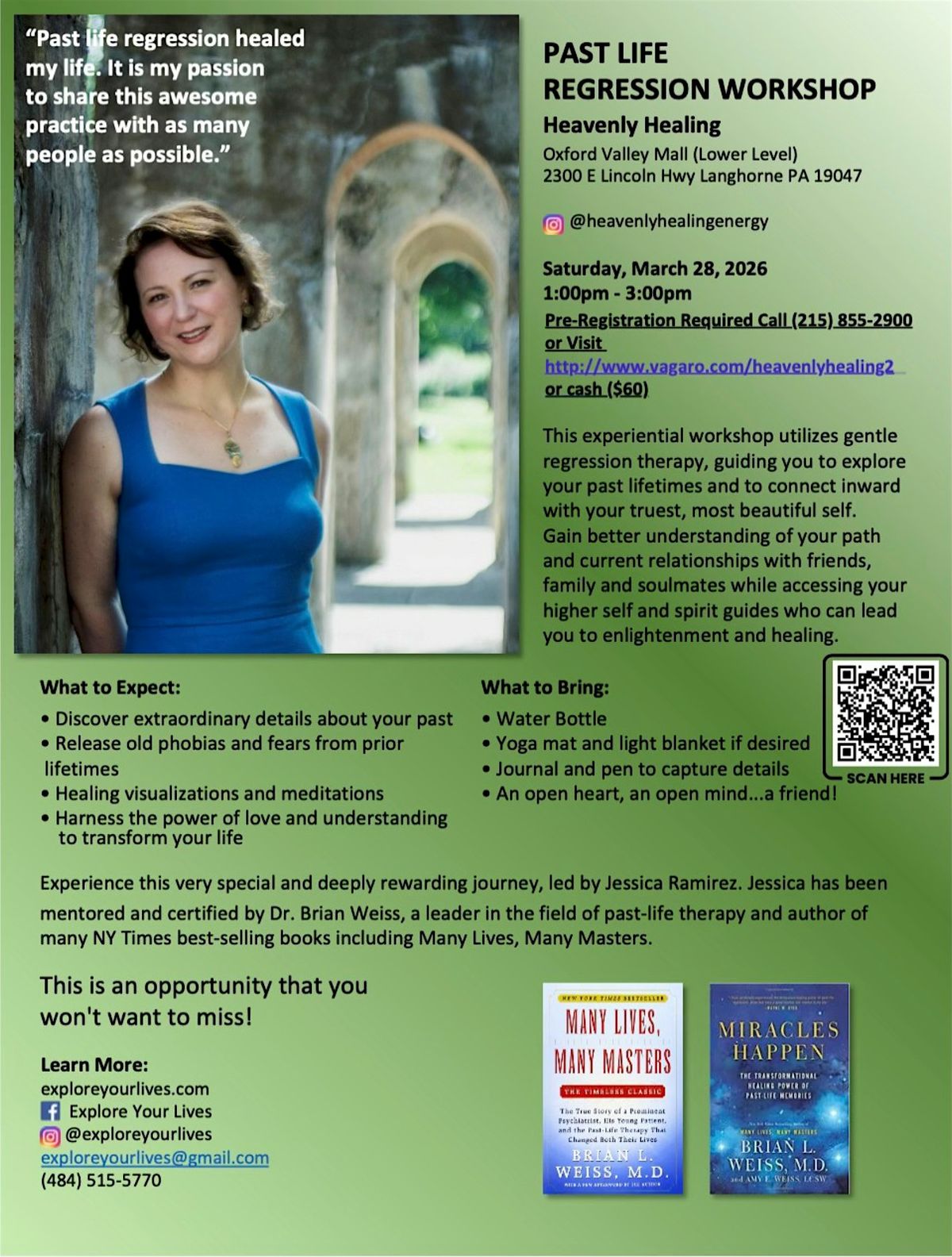 Join us for a powerful Past Life Regression Workshop led by Jessica Ramirez, certified and mentored by Dr. Brian Weiss, author of Many Lives, Many Masters. Through gentle guided regression, you’ll be supported in exploring past lifetimes, releasing fears, and reconnecting with your higher self.