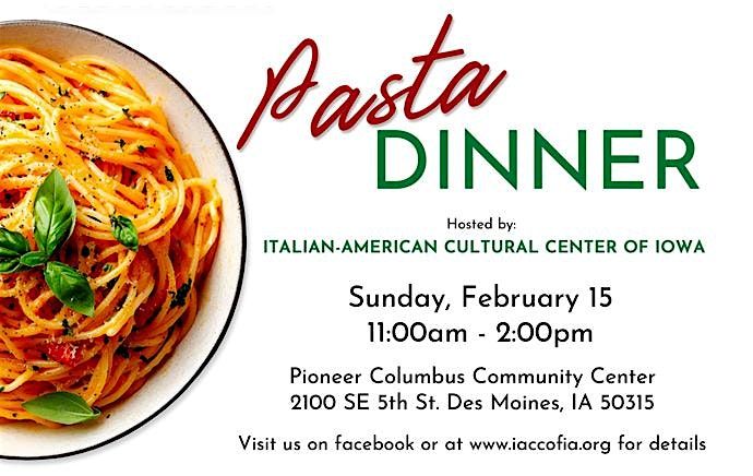 Mangia, Mangia!! 🍝 The Italian American Cultural Center of Iowa is hosting a Pasta Dinner at the Pioneer Columbus Community Recreation Center on Sunday, February 15, 2026 from 11:00 AM -2:00PM. Cost is $12 for adults, $6 for children ages 3-12, and ages 2 and under are free. We hope to see you there!