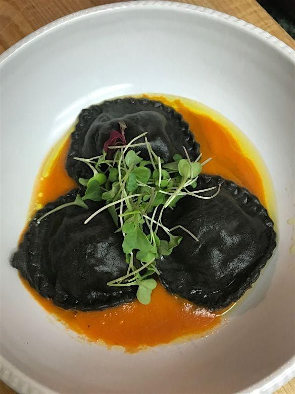 Seafood Squid Ink Ravioli - Roasted Red Pepper Sauce (Shrimp, Lobster and Scallops)