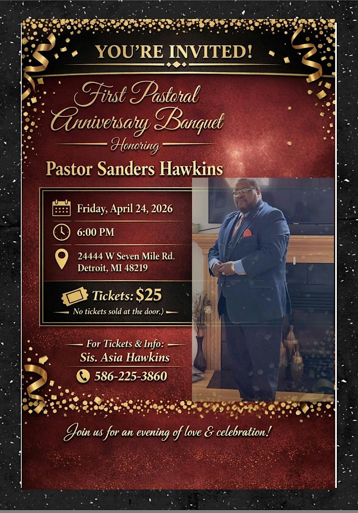 Join us in honoring an amazing Man of God for his first Pastoral Banquet. Formal attire is requested.