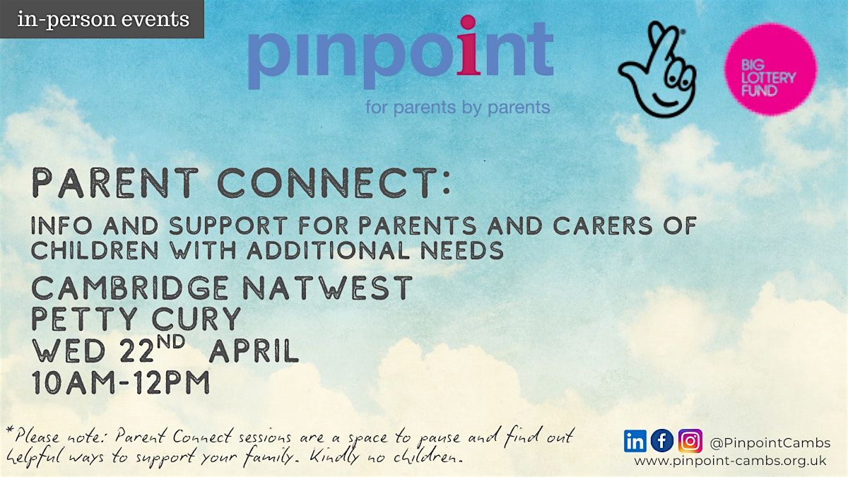 Welcome to Parent Connect Cambridge Petty Cury! Join us us at Natwest Petty Cury, for a cuppa with others in a similiar suituation and who get the joys and challenges od aditional needs parenting. We can offer a listening ear, signposting and inormation to support you where you are at.