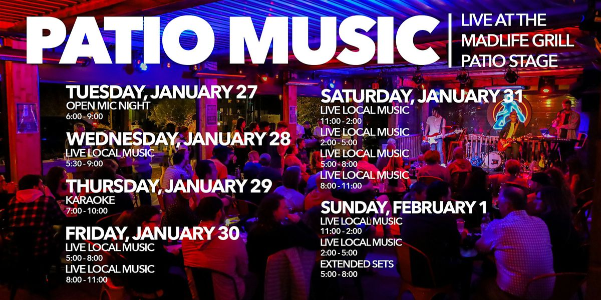 Patio Music is a FREE event that takes place at The MadLife Grill Patio Stage from January 27 - February 1, featuring local artists!
