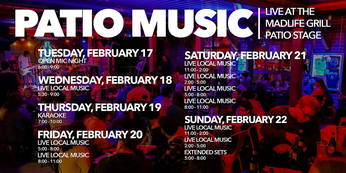 Patio Music is a FREE event that takes place at The MadLife Grill Patio Stage from February 17 - February 22, featuring local artists!