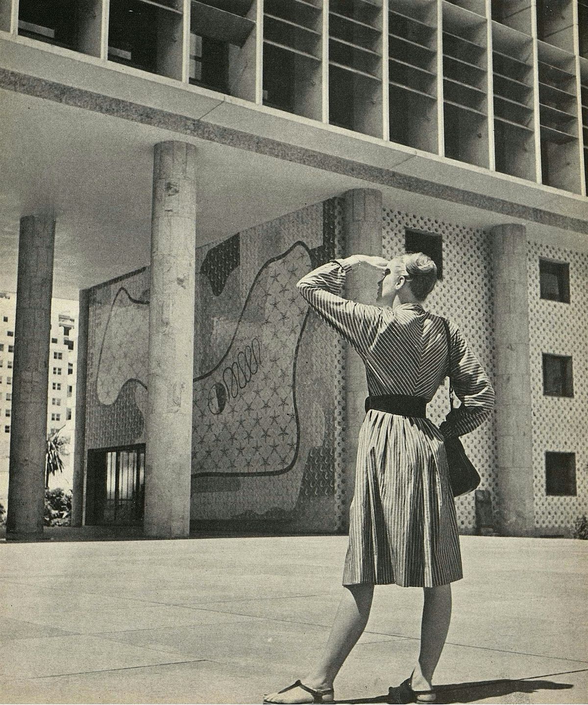 Image: Louise Dahl-Wolfe, Fashion shoot in front of the Ministério da Educação e Saúde (MES), Rio de Janeiro, Brazil, as published in, “Urban Cotton: For Being at Ease,” Harper’s Bazaar, May 1946
